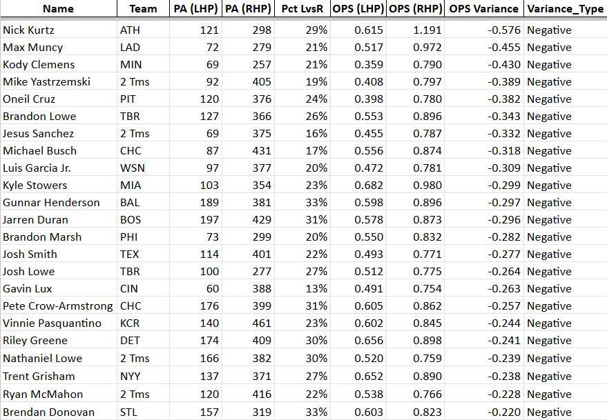 Looks like everyone’s favorite rookie slugger Nick Kurtz needs to spend some time with Kyle Schwarber this offseason. Also, a guy like Oneil Cruz with a sub-.400 OPS against lefties while being a non-platoon player has to find a way to get on base. Brandon Marsh has been a key piece for the Phillies outfield, but he’s striking out 37% of his PAs against lefties, vs. 22% against righties.
