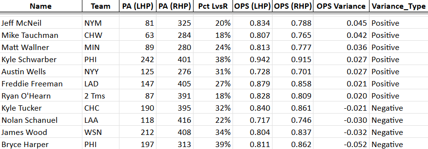 These guys are all within 50 OPS points between LHP and RHP. There’s still a difference, but these guys are all either good or average against either handedness. Look at Kyle Schwarber “embracing death” as he said and hitting with slightly reverse splits.